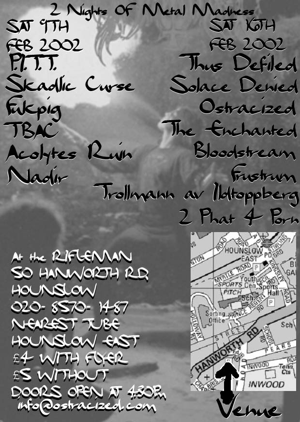 On February 9th 2002 we played at The Rifleman in Hounslow for the tentatively titled "Lodnon (sic) Nights". & while the venue was pretty small & with a very low ceiling that didn't help the sound too much, the real cause for the AWFUL sound of the night lies firmly in the hands of the soundman which was an 'investment banker'... or is than 'international banker'? Aw... who cares, I think that fucking wanker sums it up pretty nicely. Not knowing the difference between the graphic selectors & the gain ought to give you a little hint of what we had to deal with. & complaining about the sound didn't help at ALL! While the venue might be an OK place to play another gig, we'll only consider it if we have it in writing that the soundman shall either be banned from the venue, or preferably shot!