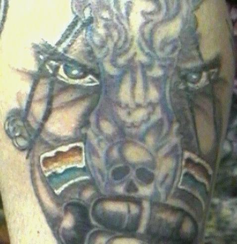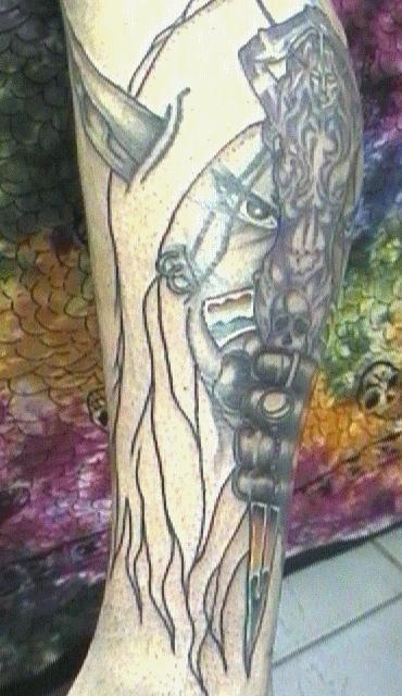 The entire tattoo once all the shading that was done was complete. OK & if U look closely @ the right eye U'll see that the hair miraculously skips thru it..... but that was sorted out after the pic was taken.