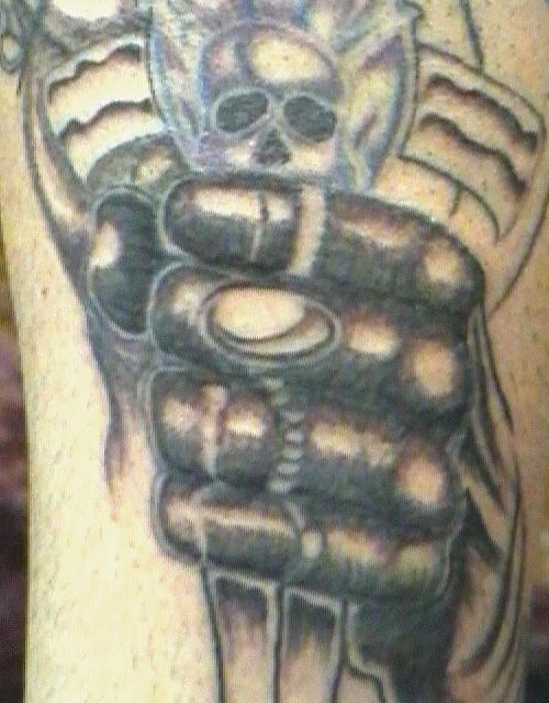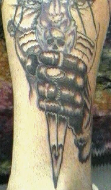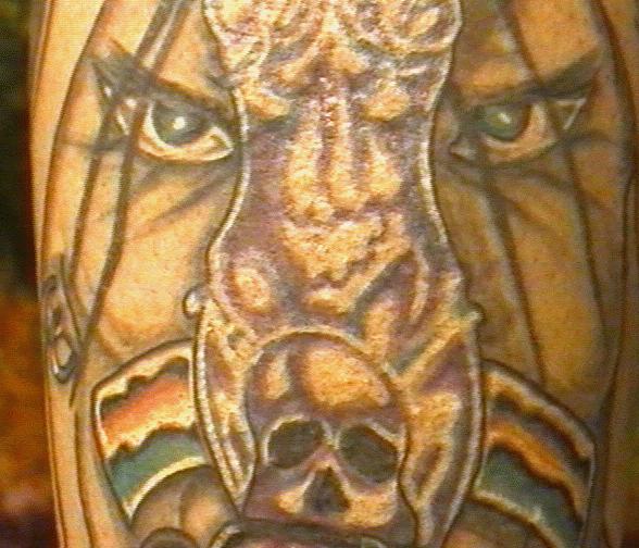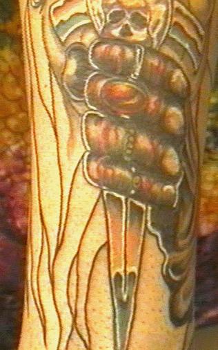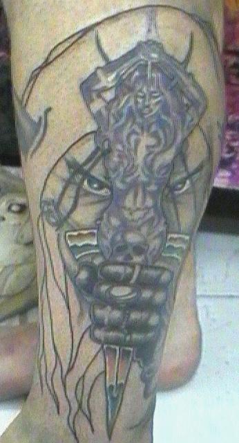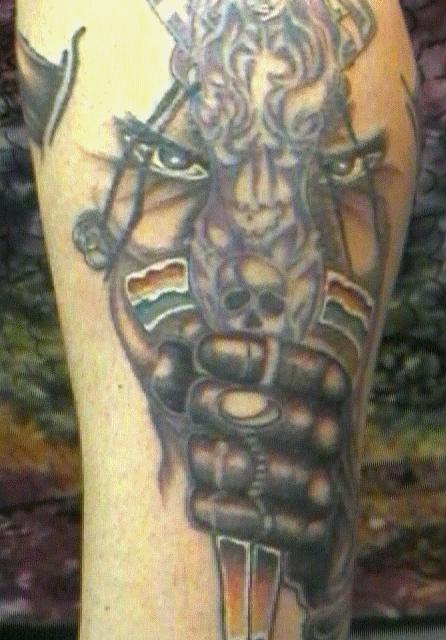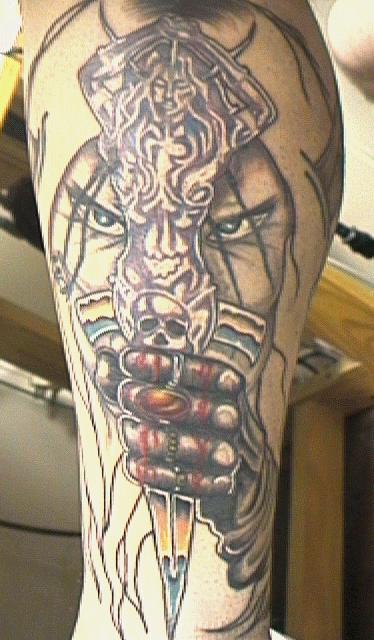 On the 21st of March 1998 a second sitting was done @ 'Skin Inc.' in Pretoria, which is a division of 'Rudy's Tattoos'. Work was done on the gloved hand, the eyes & the ears (which you don't really get to see all that well in the above pics, but they curl around the leg quite nicely).... Greywash was done on all of the above & fuck does it look good. The blade & the cross-guard have been done in a chrome finish (ie: from brown to golden brown to gold to blue) & it looks real! The eyes also had some white put in (U know, the white of the eye part) & the irises are blue. Um... what more can I say???? Oh look for yourselves.