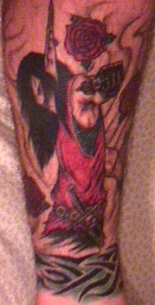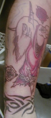 A tribal, thorn bush, band around his ankle to finish off the leg. This was done during the 2nd sitting for the Eddie piece.